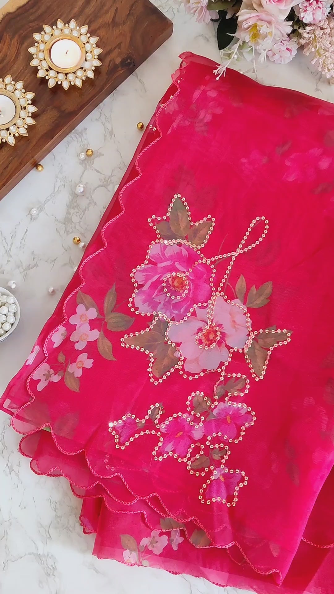 Featuring this Cherry Red Floral Sequinwork Organza Saree with cutwork scallop border detail. It is paired with a plain Dupion blouse which is stitched in back open and sleeveless pattern.