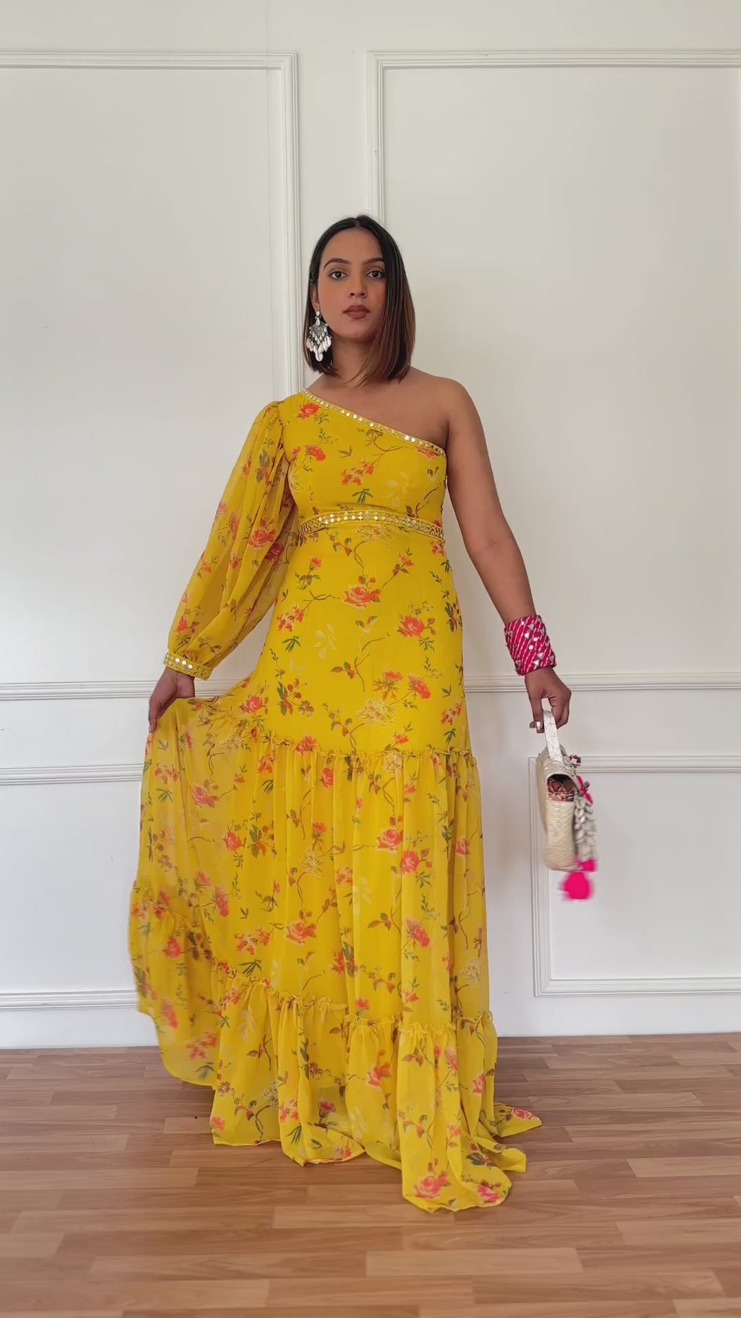 Sapna One Shoulder Mustard Printed Georgette Mirrorwork Dress