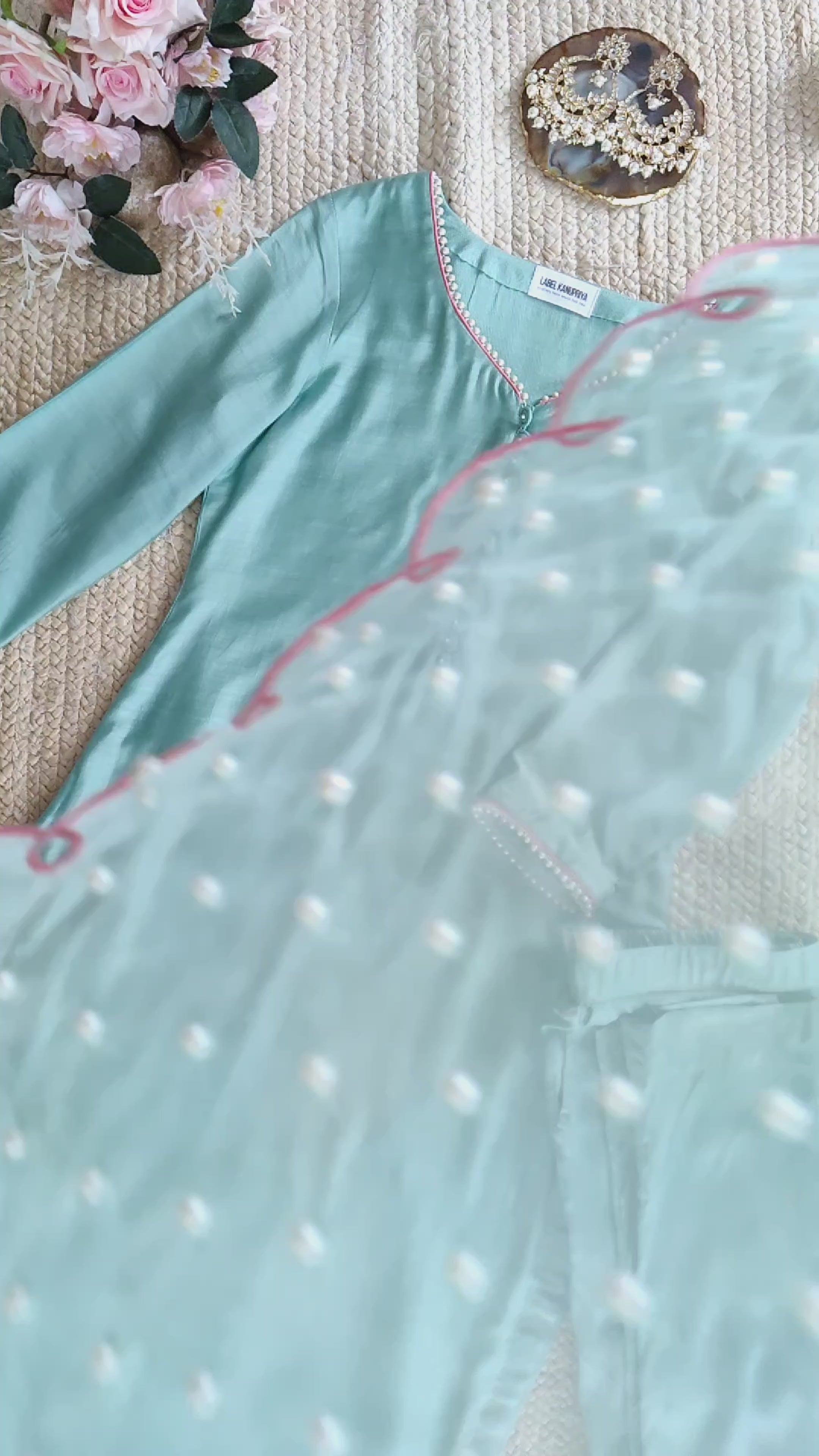 Aqua Kurta Set with Pearl Work Organza Cutwork Dupatta