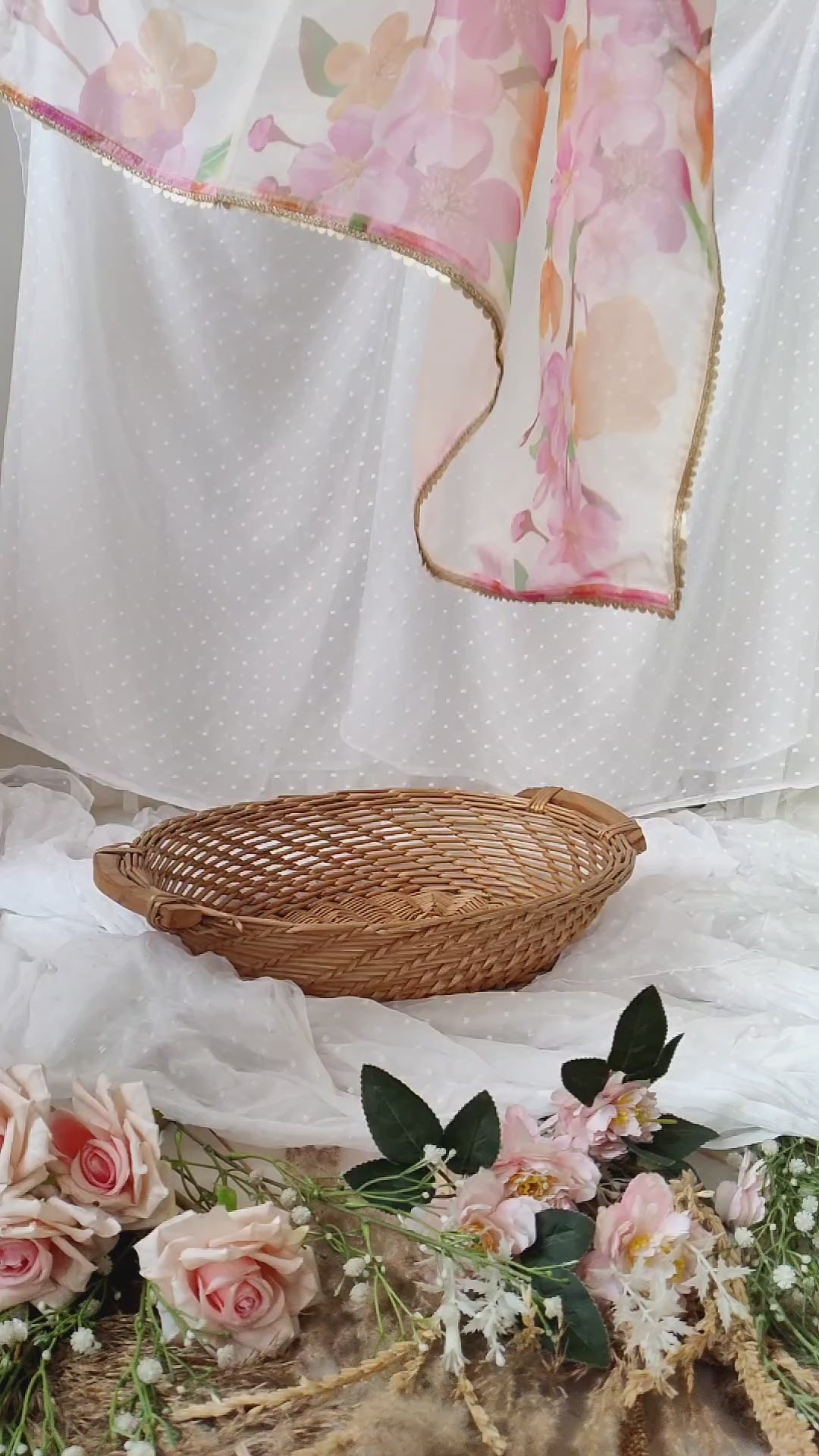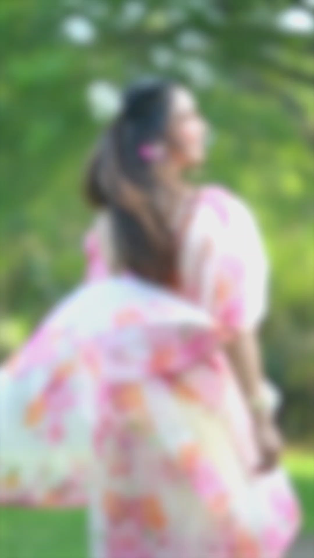 Featuring this Off-white floral printed Organza saree with sequin lace border detail. It is paired with a same floral organza blouse with dramatic balloon sleeves. The stitched blouse comes with a V-neck