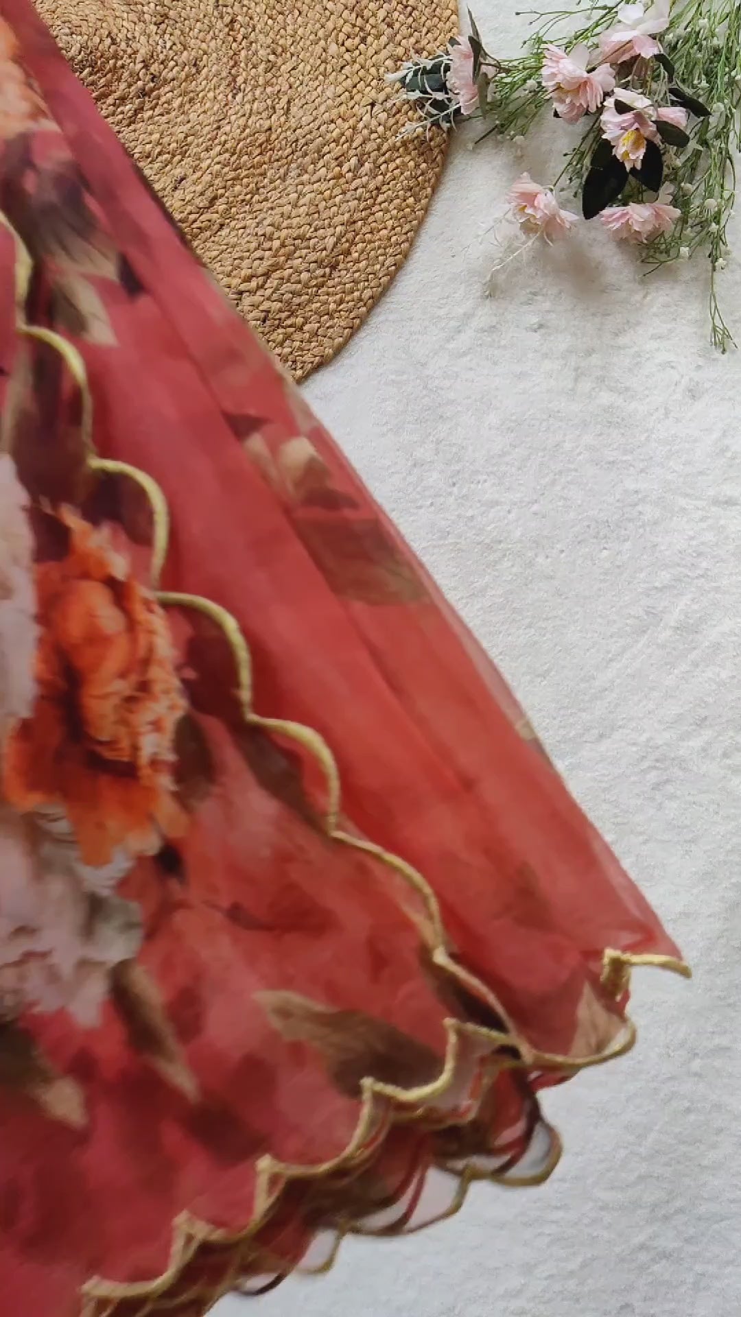 Featuring this Coral Red Floral Organza saree with cutwork scallop border detail. It is paired with a Velvet Blouse which is stitched with front open v-neck