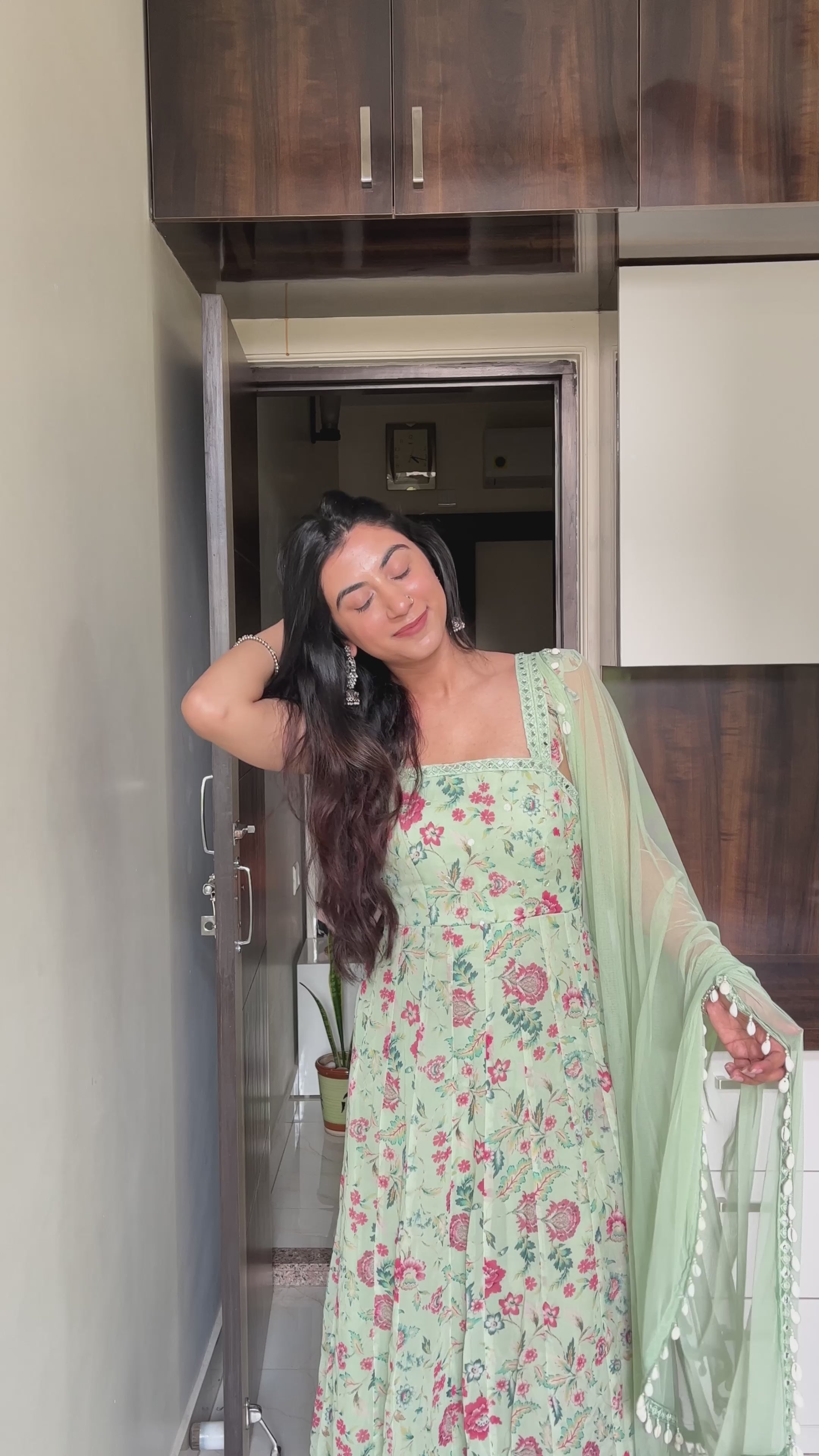 Riya Laurel Green Floral Printed Georgette Mirrorwork Anarkali
