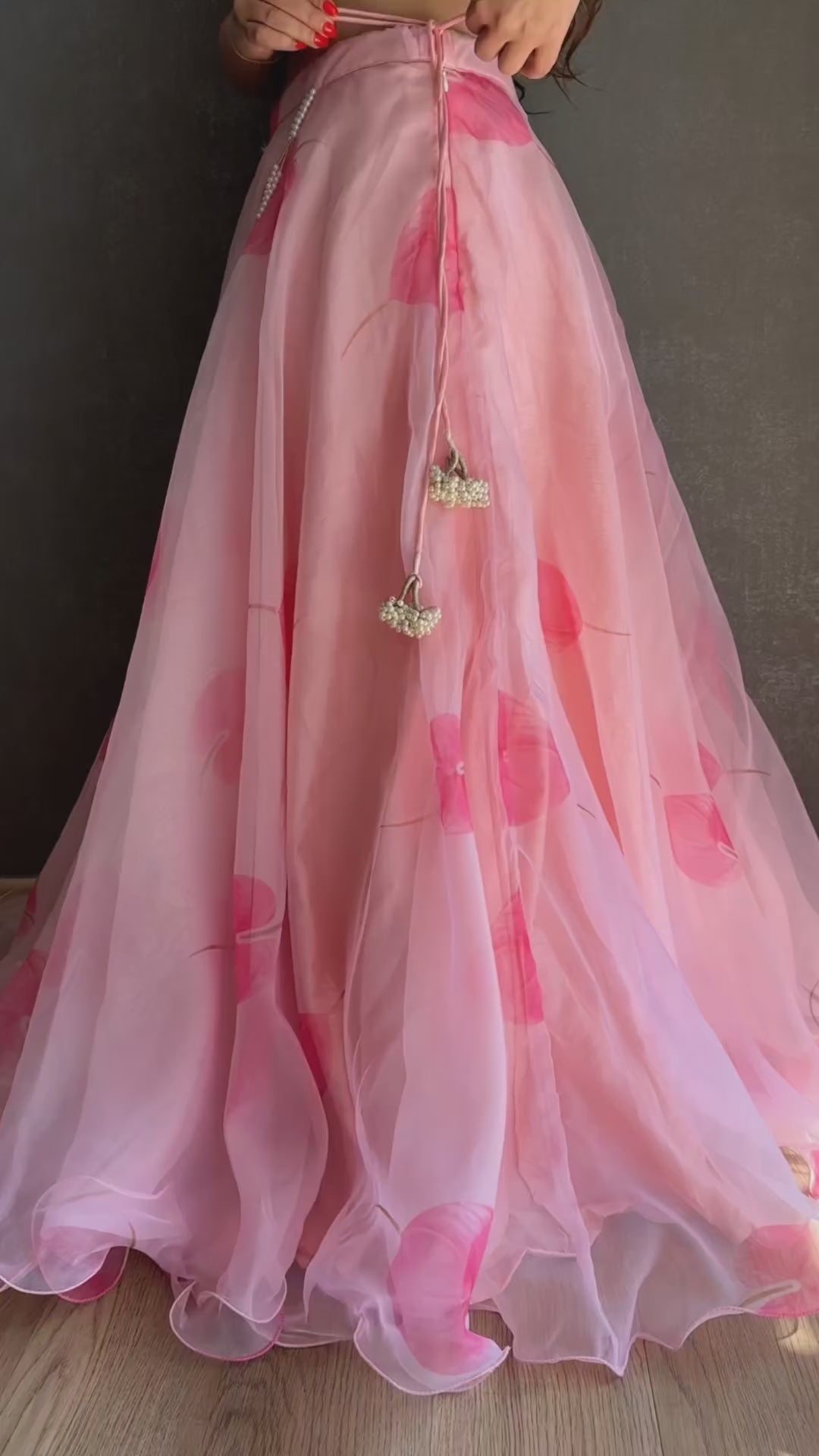 - Pink leaf organza lehenga in full circular flare