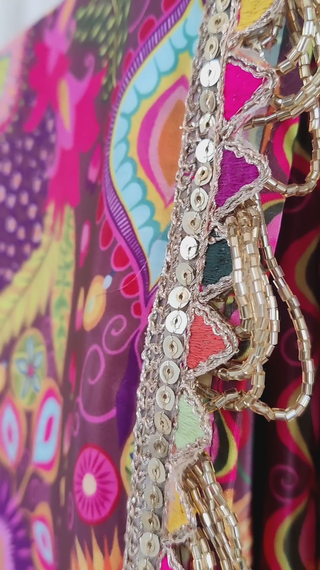 Featuring this stunning Purple Printed Crepe Saree with solid contrasting pink blouse. Golden Cutdana hangings details in pallu border. The saree has a colorful lace border all around. Stitched blouse has back tie-up detail with handmade tassels and is sleeveless.