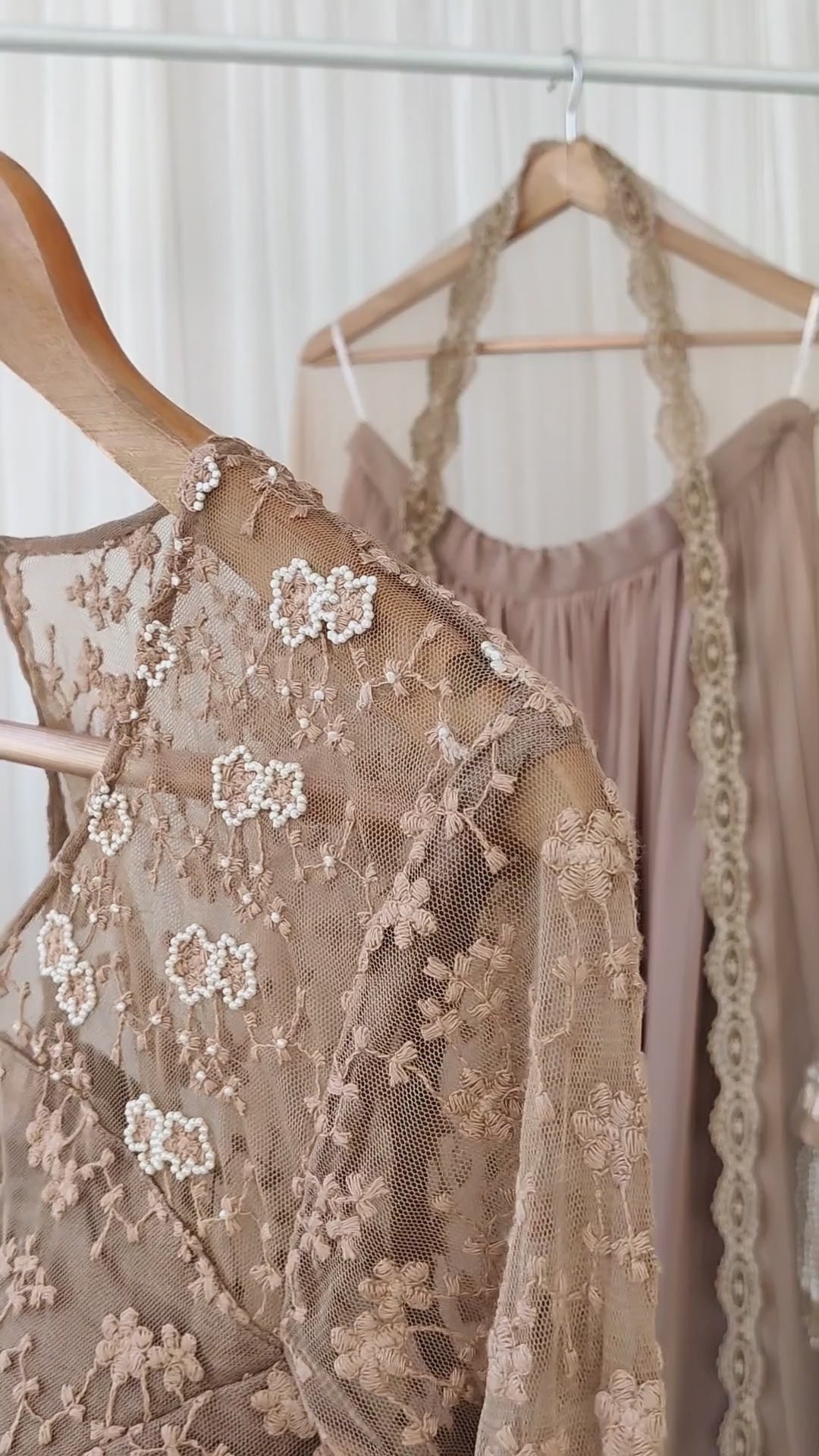 - Gathered frill and pearl lace border at the hem